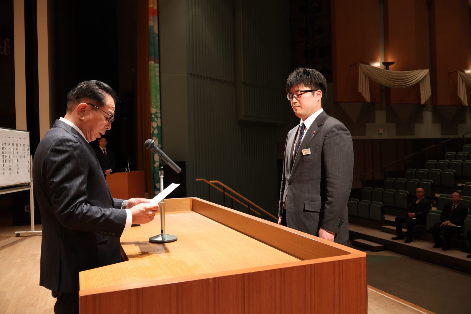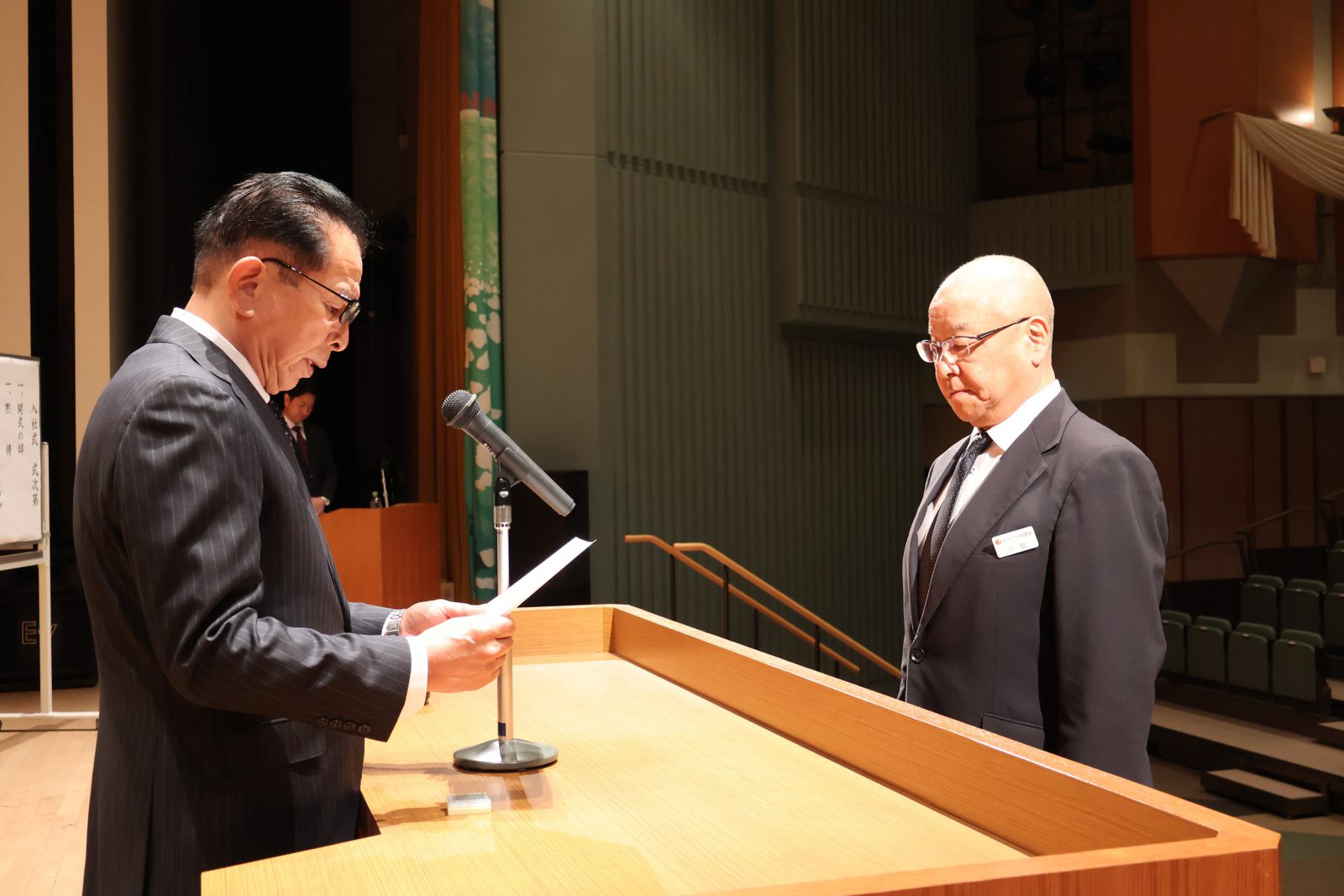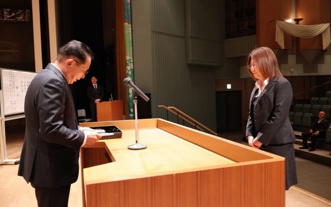 式では、黙祷、創始者の遺訓の唱和を全社員でおこなった後、社長より新入社員に辞令が交付されました。その後、社長より訓示をいただき、今年度の社長方針並びに目標の発表がありました。