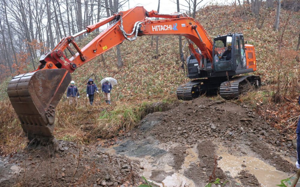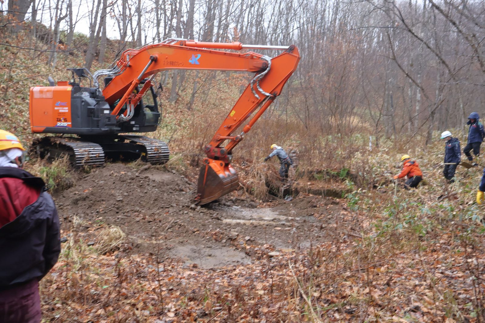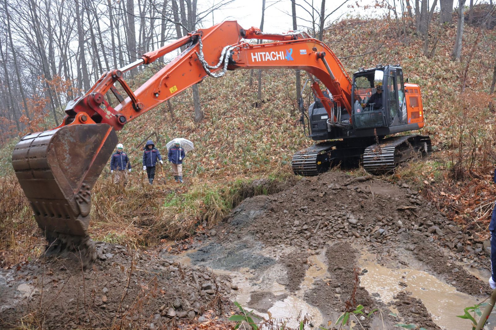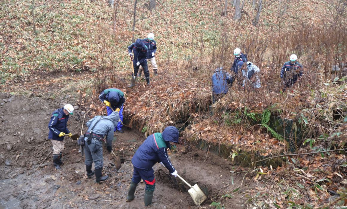 排水機能を確保するため、重機やスコップを使い明渠排水路内に溜まった堆積土砂を掻き出したほか、大きな石を手で取り除くなど、全員で寒空のもと作業を進めました。